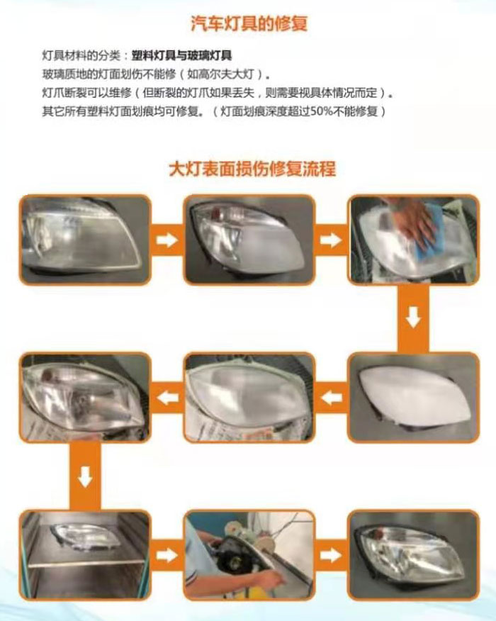 玻璃質(zhì)地的燈面劃傷不能修(如高爾夫大燈),燈爪斷裂可以維修(但斷裂的燈爪如果丟失,則需要視具體情況而定),燈面明顯凹陷,大燈罩破裂,燈罩邊緣嚴(yán)重缺失,燈腳缺失不可修復(fù),其它所有塑料燈面劃痕均可修復(fù)。修面:劃痕深度不超過燈面厚度1/2,可修復(fù)。修腳:燈腳斷裂。舊件在,可修復(fù),同一大燈最多斷裂不能超過3個(gè)燈腳。備注:高額配件舊燈角缺失,可找舊燈角代替。